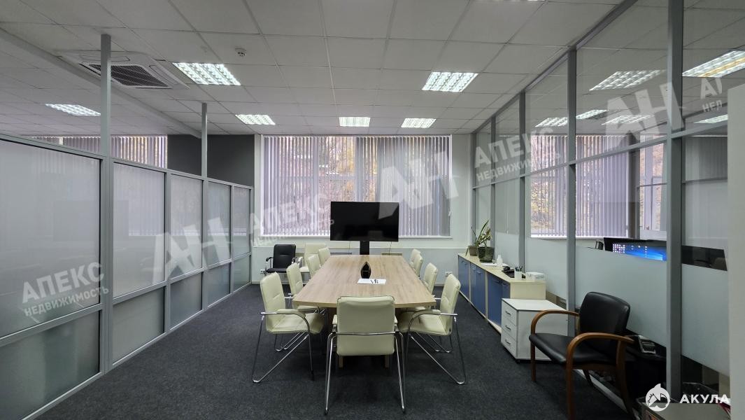 Помещение обладает высокой степенью естественной освещенности за счет качественного остекления. Высота потолков до перекрытия составляет 4 метра. Установлено подвесное потолок системы «Армстронг». Напольное покрытие представлено ковролином. Стены выполнены из окрашенных обоев и дополнены стеклянными перегородками с металлической раскладкой.