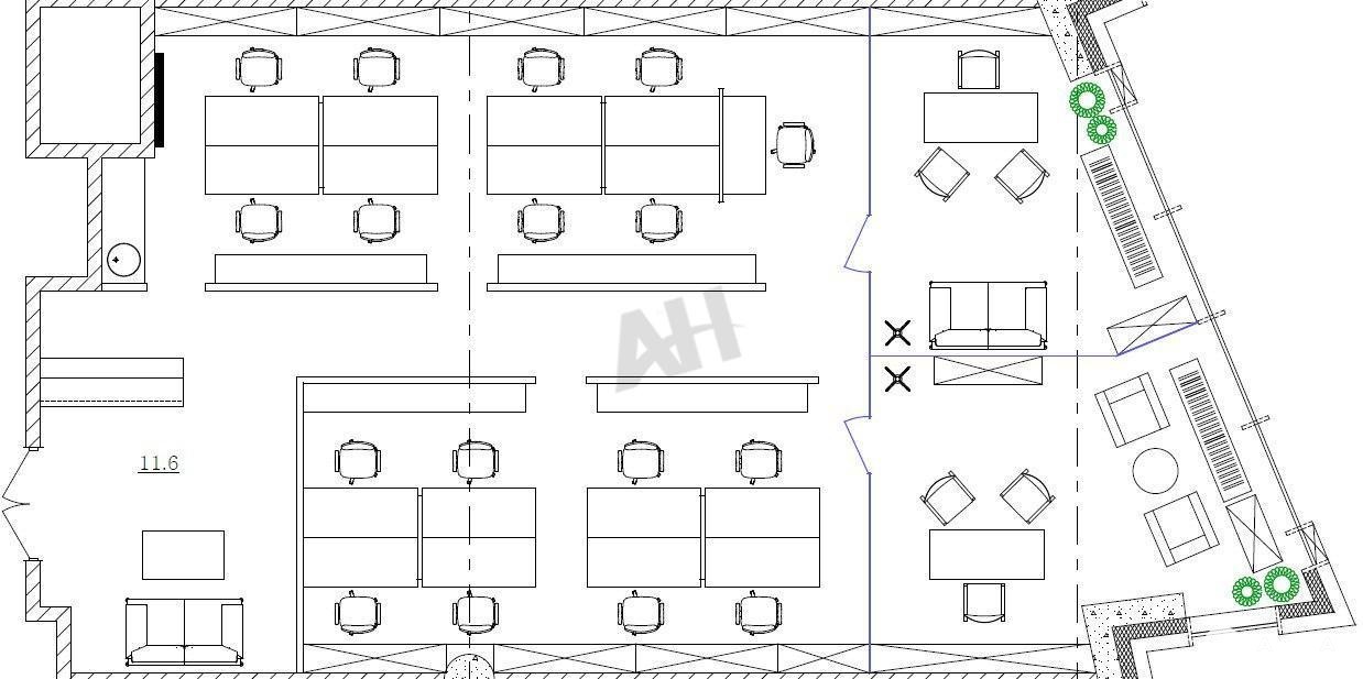 Смешанная планировка: open space, два отдельных кабинета, из стеклянных перегородок, пол керамогранит, стены покрашены в два слоя водоэмульсионной краской. Панорамные витражные окна, с форточками.