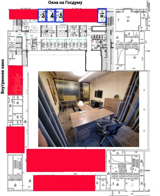 Пространство оформлено в европейском стиле с использованием качественных отделочных материалов и модной эргономичной мебели. Офис расположен рядом с основным ресепшн на 5 этаже, имеет панорамные окна с видом на Государственную Думу и Большой театр, а также выход на балкон. Оборудован индивидуальной системой кондиционирования и комфортным для зрения освещением. Расположение: