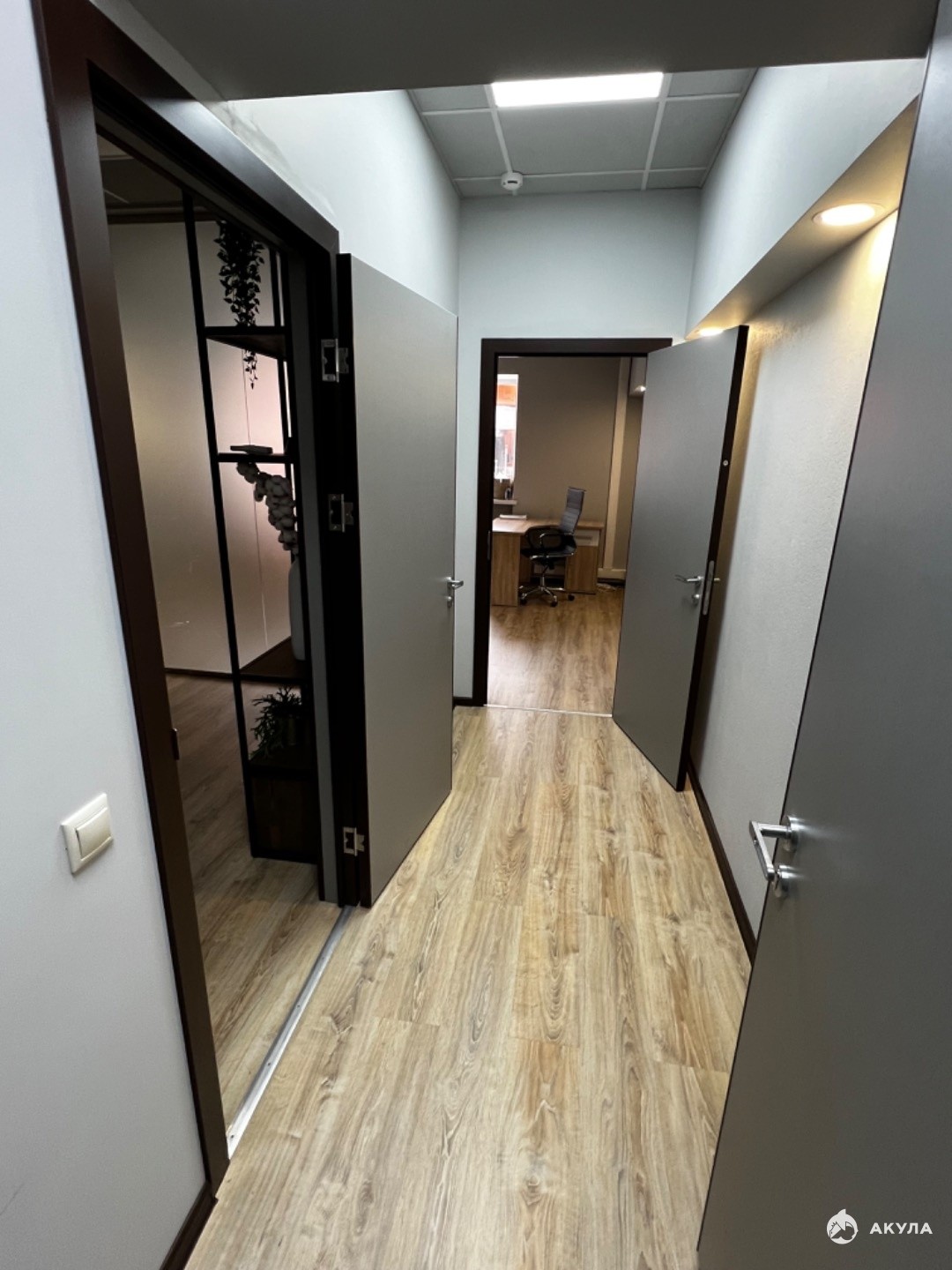 Смешанная планировка: опен спейс, кабинеты, переговорная, сану узлы, кухня и гардероб.