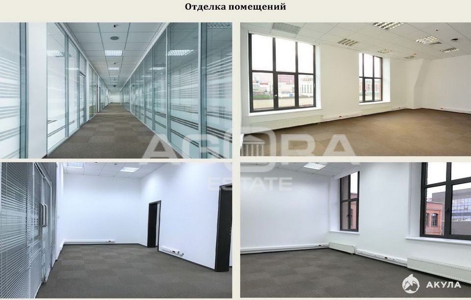 В офисах выполнена отделка класса «В+»: подвесной потолок Армстронг, освещение «под ключ», стены окрашены, ковролинная плитка в рабочих зонах, керамогранитная плитка в коридорах и санузлах, стеклянные офисные перегородки, санитарные комнаты отделаны и оснащены соответствующим оборудованием.