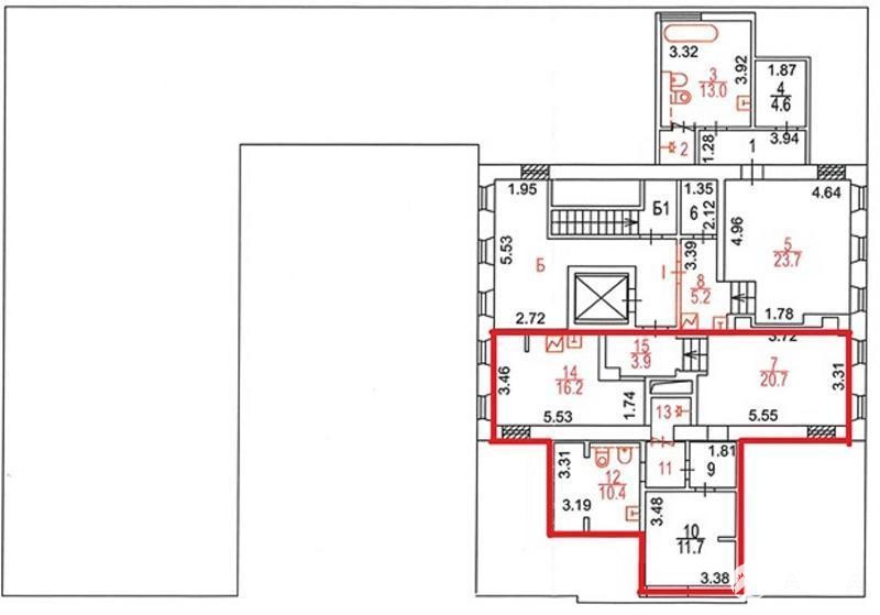Офисное помещение состоит из двух больших комнат (21 и 16 кв. м) и одной комнаты поменьше (12 кв. м), плюс санузел. Также есть места общего пользования с креслами, диванами. Везде домашний уют и домашняя атмосфера. Смотрите схему: границы, сдаваемого помещения, выделены красным цветом.