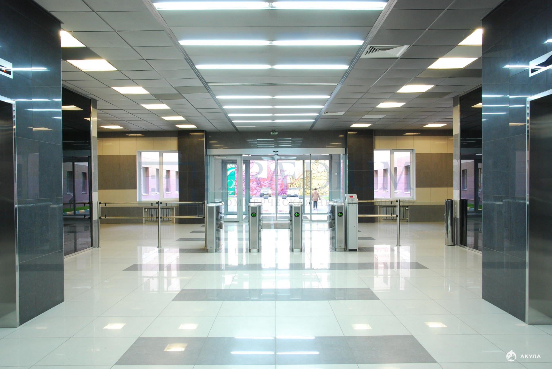 5 кабинетов, 40 рабочих мест, ресепшн, гардеробная, мастерские с автономным охлаждением и шумоизоляцией, ЦОД на 45 кВт с прецизионным кондиционером Shtulz, ИБП Eaton на 100 кВт.