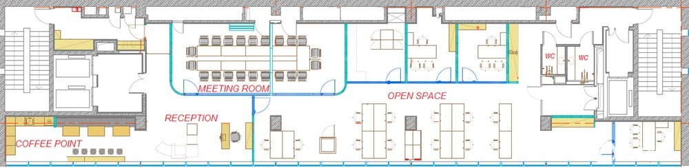 Масштабируемость: Планировка позволяет разместить около 40 сотрудников с зонированием по отделам