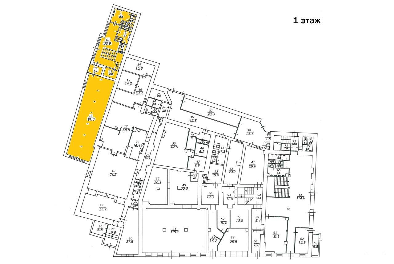 Помещение занимает два этажа 1 этаж 161, 8 кв.м. , 2 этаж 503, 1 кв.м. , состоит: 3 залов, служебные помещения, подсобные и складские помещения, 8 с/у. Отдельный вход с центральной улицы.