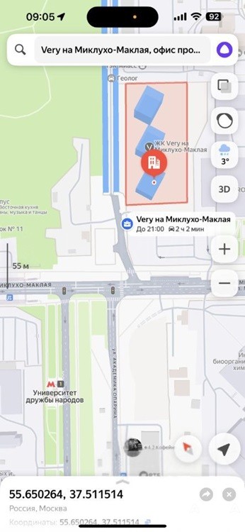 Первая линия ул. Миклухо-Маклая. До входа в метро Университет дружбы народов 3 минуты пешком, до метро Беляево 10 минут пешком. До автобусной остановки 2 минуты пешком.