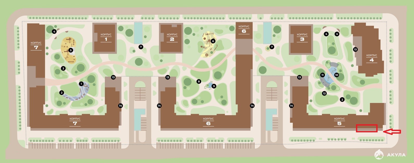 Расположено вдоль центральной дороги, рядом подземный переход, соединяющий все кварталы жилого комплекса.