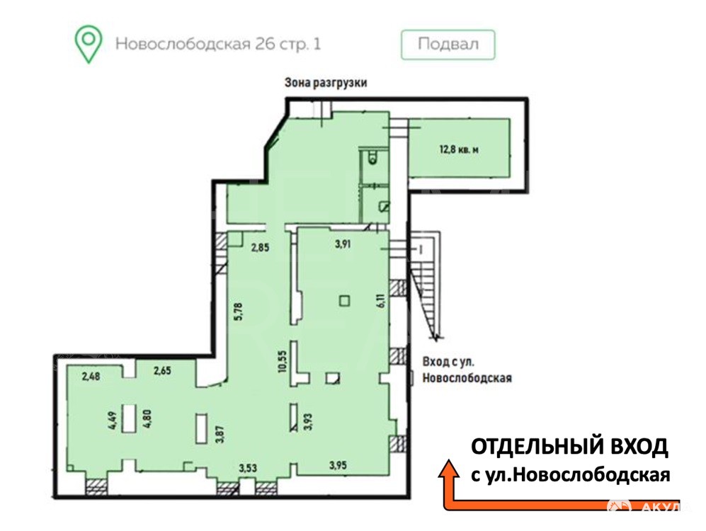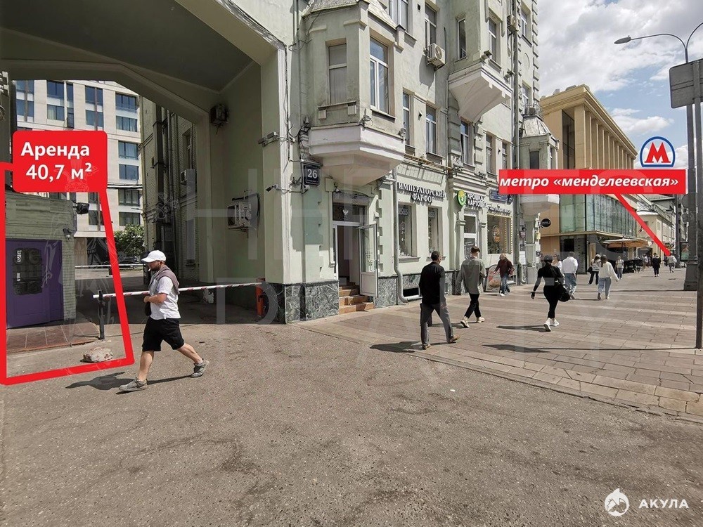Аренда помещения (ПСН) 132, 8 м2 м. Менделеевская в ЦАО Площадь: 132, 8 кв. м Арендная ставка: 370 000 руб./мес. (НДС включен) Коммунальные платежи: Эксплуатационные расходы + коммунальные услуги оплачиваются отдельно по счетчикам Этаж: Цокольный (с отдельным входом) Доступ: 24/7 Электромощность: 40 кВт Вентиляция: Приточно-вытяжная Особые возможности: Возможно получение алкогольной лицензии Расположение и преимущества локации Адрес: г. Москва, ул. Новослободская, 26 (Бизнес-центр Новослободская 26 ) Транспортная доступность: В пешей доступности станции метро: Менделеевская , Новослободская , Савёловская . Первая линия улицы Новослободская высокая видимость и проходимость. Пешеходный трафик: 1600 человек в час (по данным СберБизнес) гарантированный поток потенциальных клиентов. Окружение: Во дворе здания расположены элитные жилые комплексы Реномэ и Мезонруж . Жители этих комплексов проходят и проезжают через арку прямо мимо входа в сдаваемое помещение , что создаёт дополнительный поток платёжеспособной аудитории. Рядом плотная офисная застройка, бизнес-центры. Характеристики помещения Отдельный вход с 1-й линии улицы Новослободская максимальная узнаваемость и удобство для посетителей.