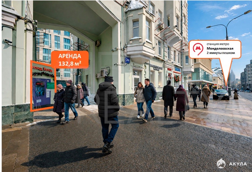 Аренда помещения (ПСН) 132, 8 м2 м. Менделеевская в ЦАО Площадь: 132, 8 кв. м Коммунальные платежи: Эксплуатационные расходы + коммунальные услуги оплачиваются отдельно по счетчикам Этаж: Цокольный (с отдельным входом) Доступ: 24/7 Электромощность: 40 кВт Вентиляция: Приточно-вытяжная Особые возможности: Возможно получение алкогольной лицензии Расположение и преимущества локации Адрес: г. Москва, ул. Новослободская, 26 (Бизнес-центр Новослободская 26 ) Транспортная доступность: В пешей доступности станции метро: Менделеевская , Новослободская , Савёловская . Первая линия улицы Новослободская высокая видимость и проходимость. Пешеходный трафик: 1600 человек в час (по данным СберБизнес) гарантированный поток потенциальных клиентов. Окружение: Во дворе здания расположены элитные жилые комплексы Реномэ и Мезонруж . Жители этих комплексов проходят и проезжают через арку прямо мимо входа в сдаваемое помещение , что создаёт дополнительный поток платёжеспособной аудитории. Рядом плотная офисная застройка, бизнес-центры. Характеристики помещения Отдельный вход с 1-й линии улицы Новослободская максимальная узнаваемость и удобство для посетителей.