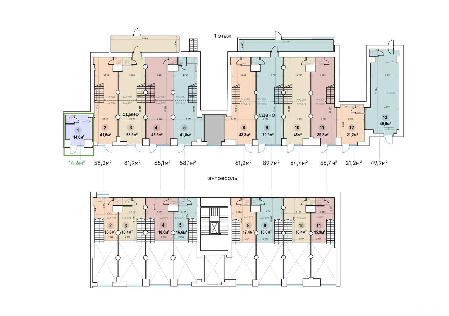 Доступны разные площади - от 14 до 65 м². Электрическая мощность - 50 кВт. Высота потолков - 4.8 м. Помещение расположено на первой линии, имеется отдельный выход с улицы и большие витринные окна.