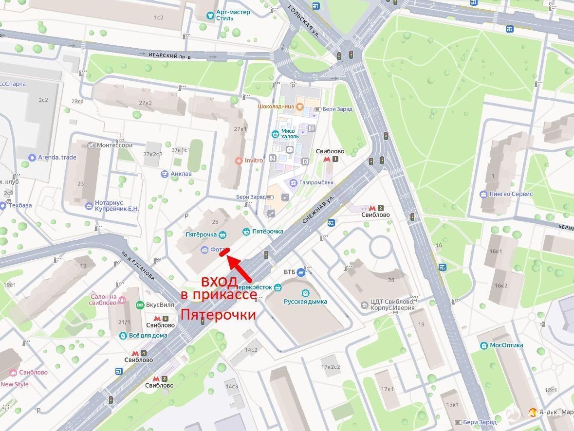 Предлагаем в аренду помещение в прикассовой зоне супермаркета «Пятерочка» прямо у выхода из метро Свиблово, по адресу: ул. Снежная, д. 25.