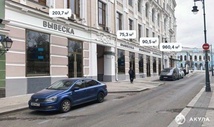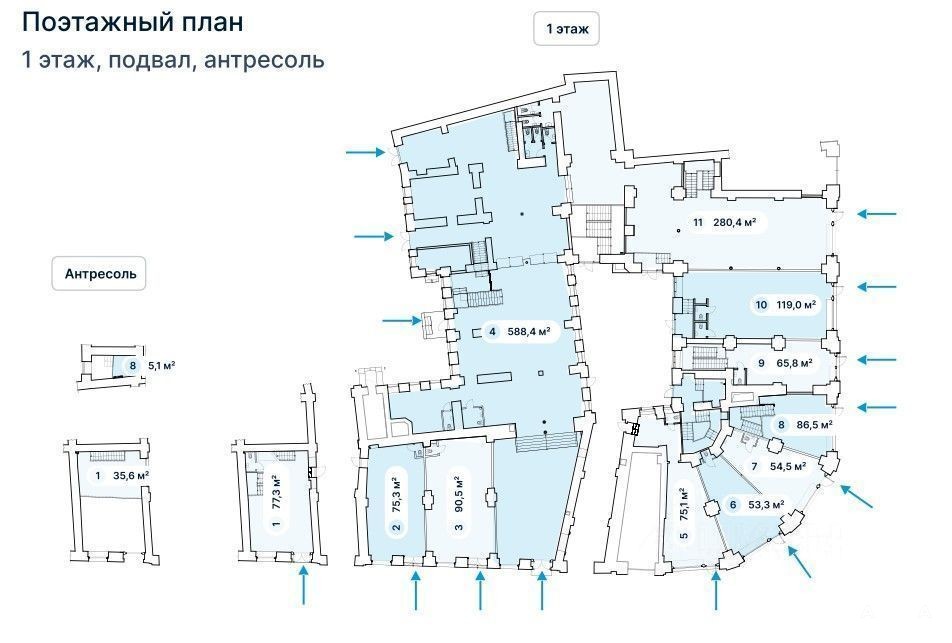 Описание помещения: Помещение с отдельным входом. Расположено в подвале, на 1 этаже и антресоли. Площадь подвала - 90, 8 м2, 1 этаж - 77, 3 м2, антресоль - 35, 6 м2. Большие витринные окна по периметру помещения.
