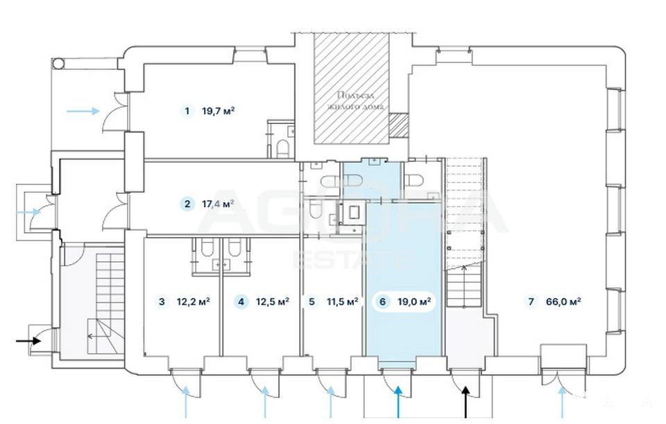 Площадь - 19 м2. Полностью на 1-м этаже (на плане - блок 6). Отдельный вход с улицы. Планировка - открытая (сетка колонн). Состояние - под чистовую отделку. Все городские коммуникации. Место для размещения вывески на фасаде.
