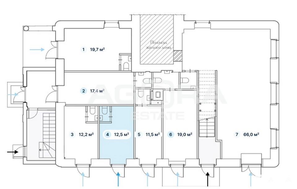 Площадь - 12, 5 м2. Полностью на 1-м этаже (на плане - блок 4). Отдельный вход с улицы. Планировка - открытая (сетка колонн). Состояние - под чистовую отделку. Все городские коммуникации. Место для размещения вывески на фасаде.