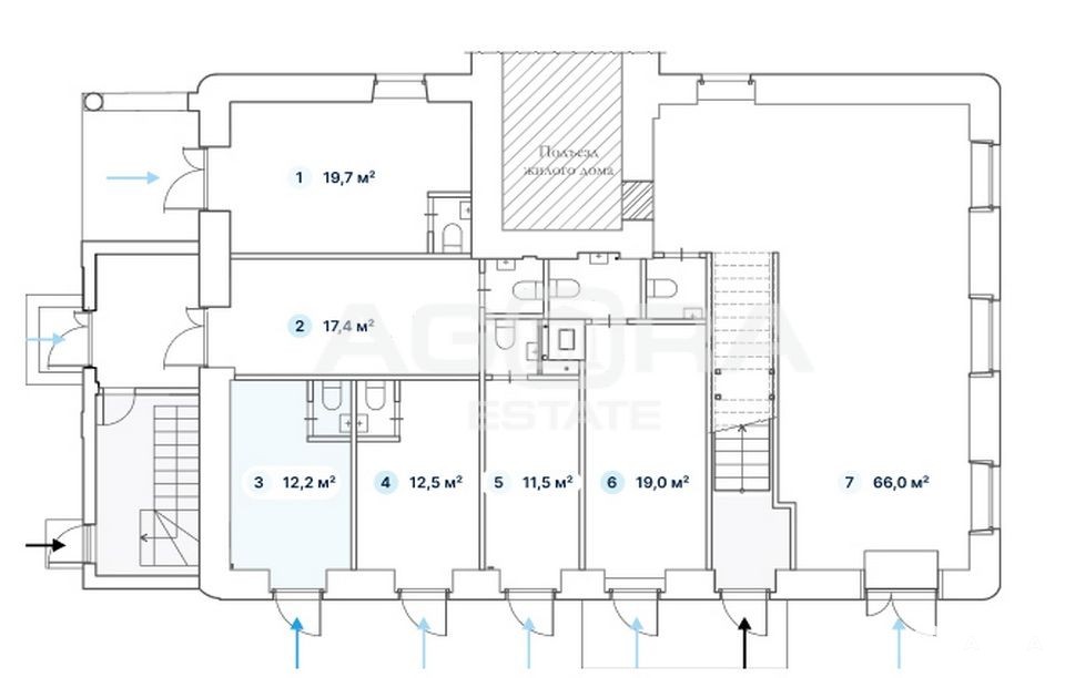 Площадь - 12, 2 м2. Полностью на 1-м этаже(на плане - блок 3). Отдельный вход с улицы. Планировка - открытая (сетка колонн). Состояние - под чистовую отделку. Все городские коммуникации. Место для размещения вывески на фасаде.