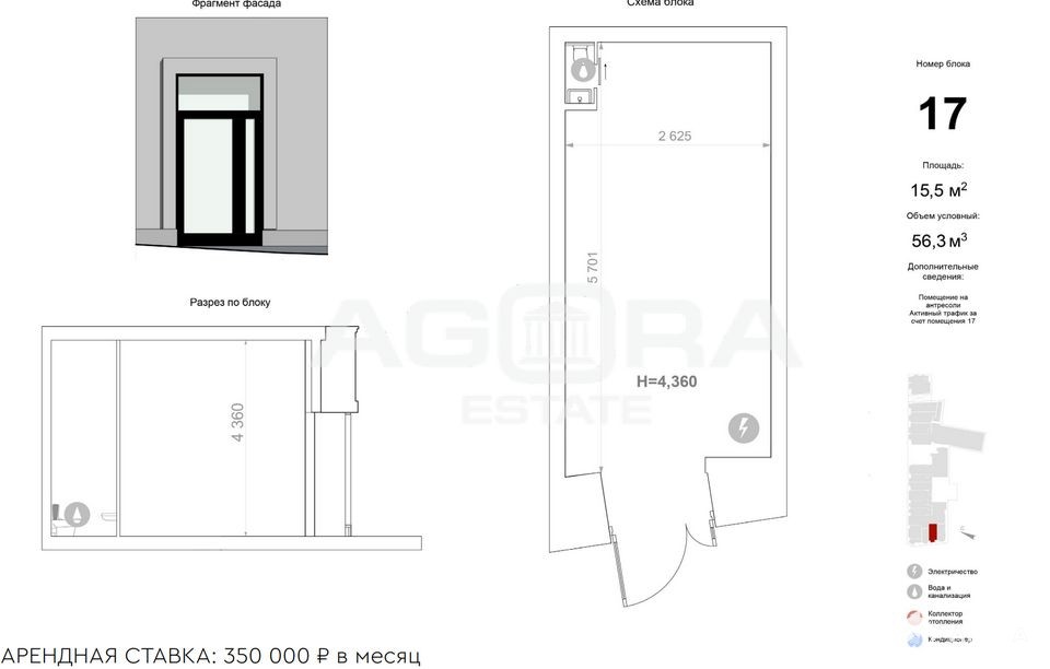 Площадь 15.5 кв.м (на плане - Блок 17), 1 этаж . Отдельный вход с улицы. Планировка открытая, высокие потолки, состояние - с отделкой.