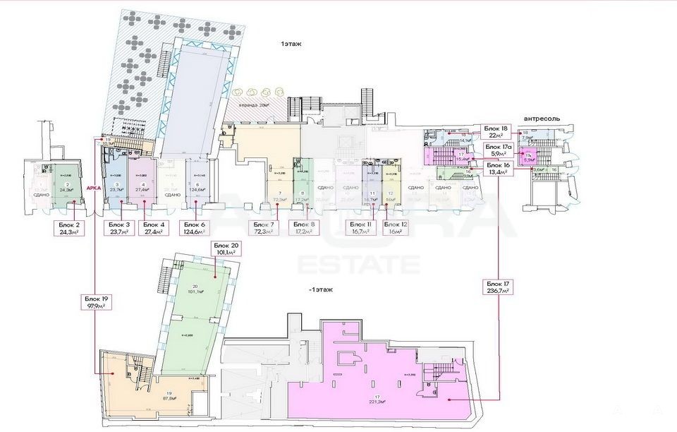 Площадь 16 кв.м (на плане - Блок 12), 1 этаж, отдельный вход с улицы. Планировка открытая, высокие потолки, состояние - с отделкой.