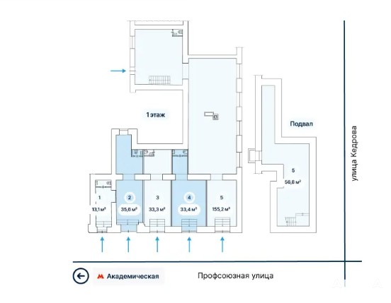Арт. 91722612. Коммерческие помещения на первой линии всего в двух минутах от метро «Академическая». Объекты расположены на 1 этаже и в подвале жилого дома. Высокая проходимость, отдельные входы с фасада и впечатляющая высота потолков создают идеальные условия для запуска успешного бизнеса.