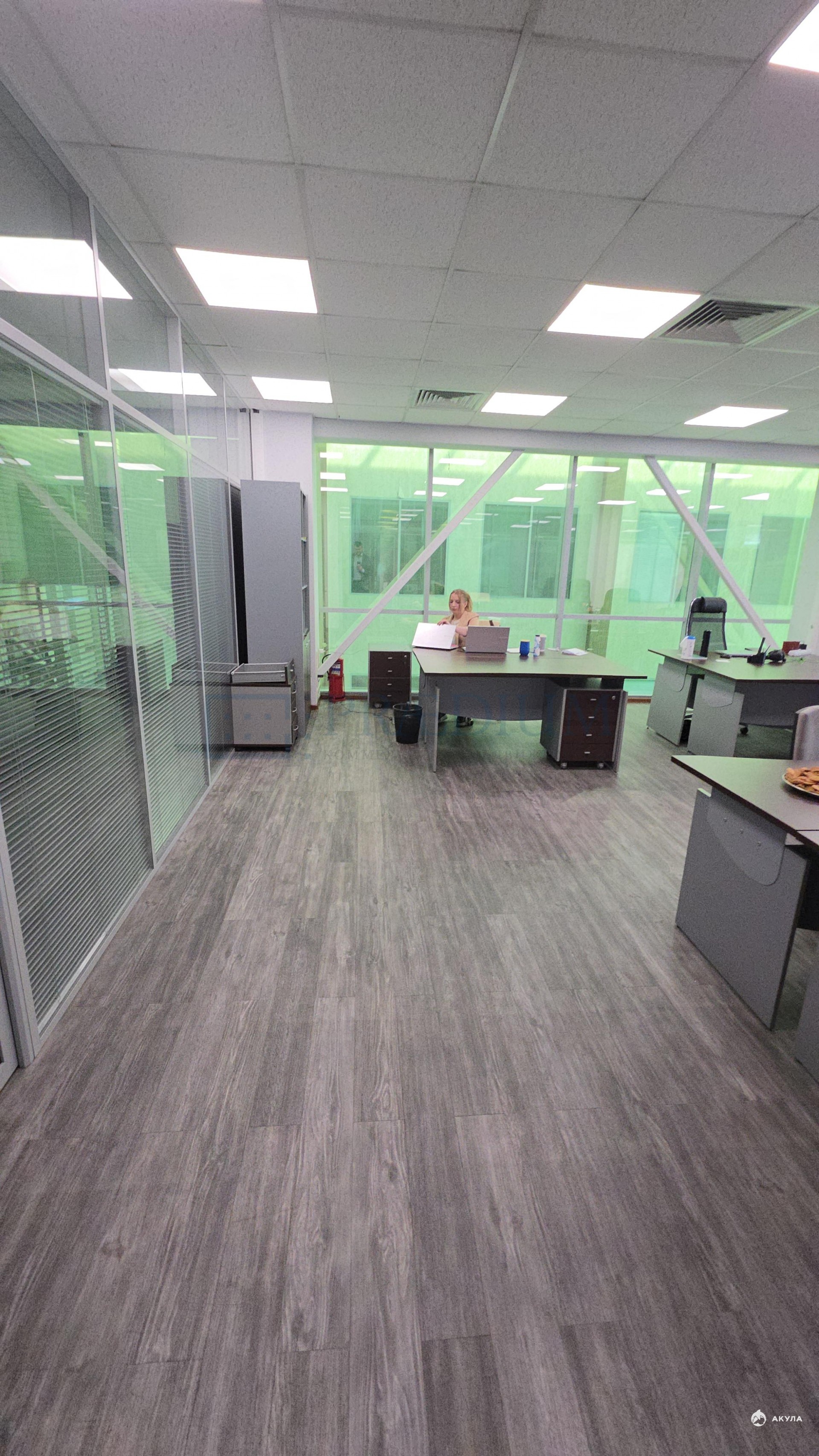 Офис после ремонта: выполнена смешанная планировка – премиум блок кабинетов для руководства с личным с/у и приемной, открытые залы сотрудников, переговорные комнаты, кухня, серверная, ресепшн, группа с/у персонала, комната СБ или архив.