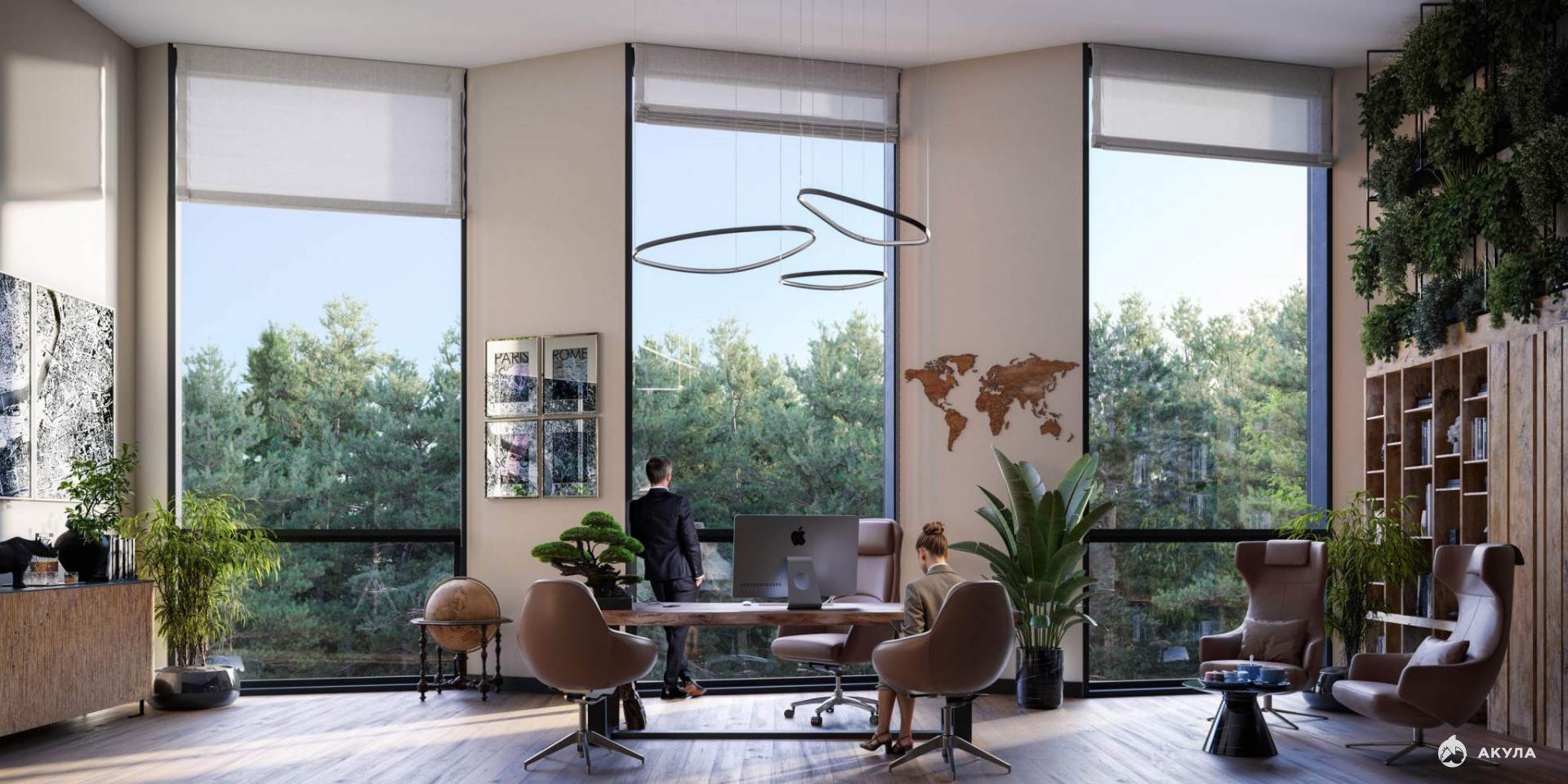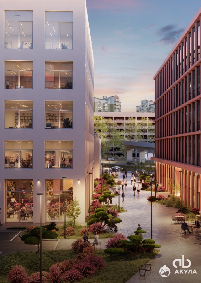 - На первых этажах офисных зданий просторные лобби с комфортной зоной ожидания, супермаркет, торговые помещения, отделения банков и сервисных служб, фитнес-студия
