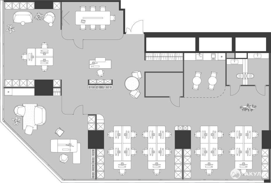 Офис под чистовую отделку, внутри открытая планировка, одна мокрая точка, тип окон - витринные, окна выходят во двор, общая площадь здания 134839.4 м, год постройки 2028 г.