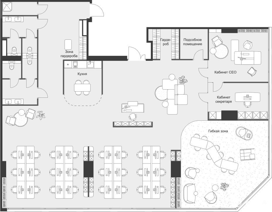 Помещение под офис площадью 299.21 м2 на 27 этаже 33-этажного здании класса A м. Зорге, район города - Хорошево-Мневники. Высота потолков: 3.6 м.