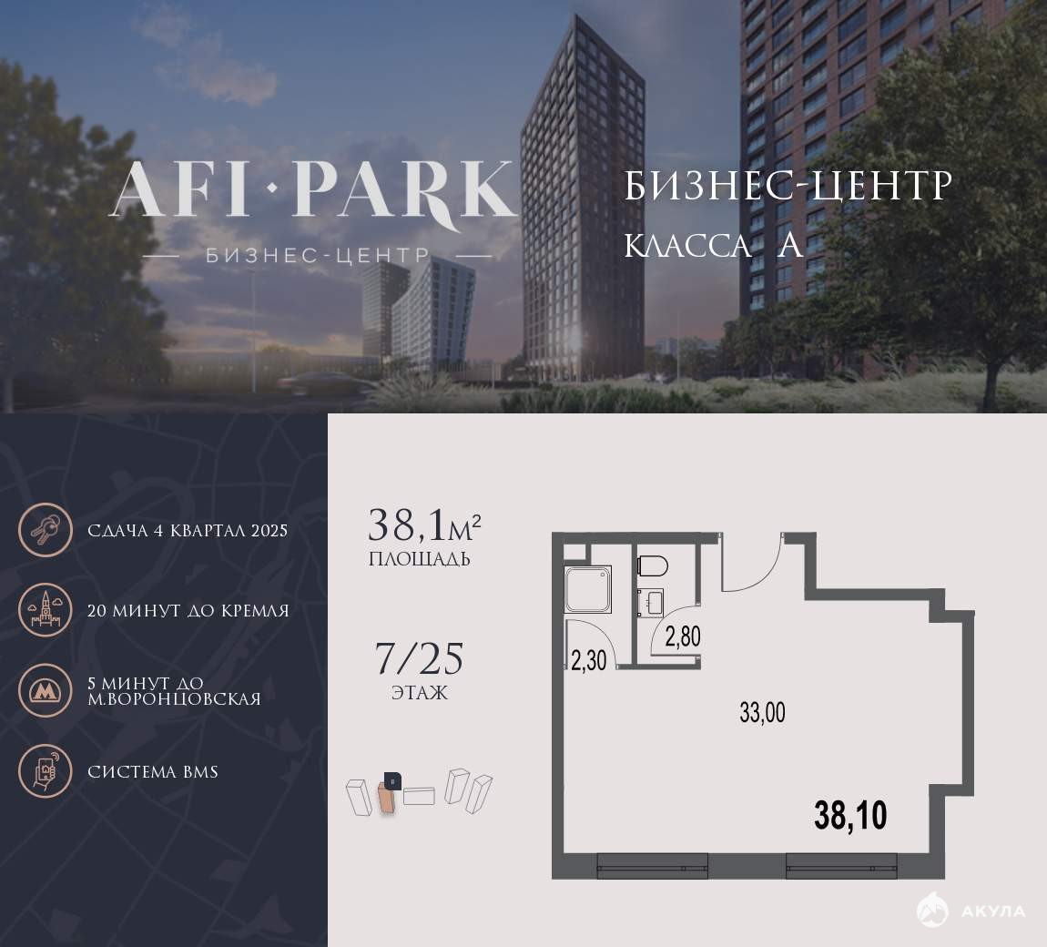 Продается просторное коммерческое помещение общей площадью 38, 1 м2 на 7 этаже в строящемся бизнес-центре AFI Park.