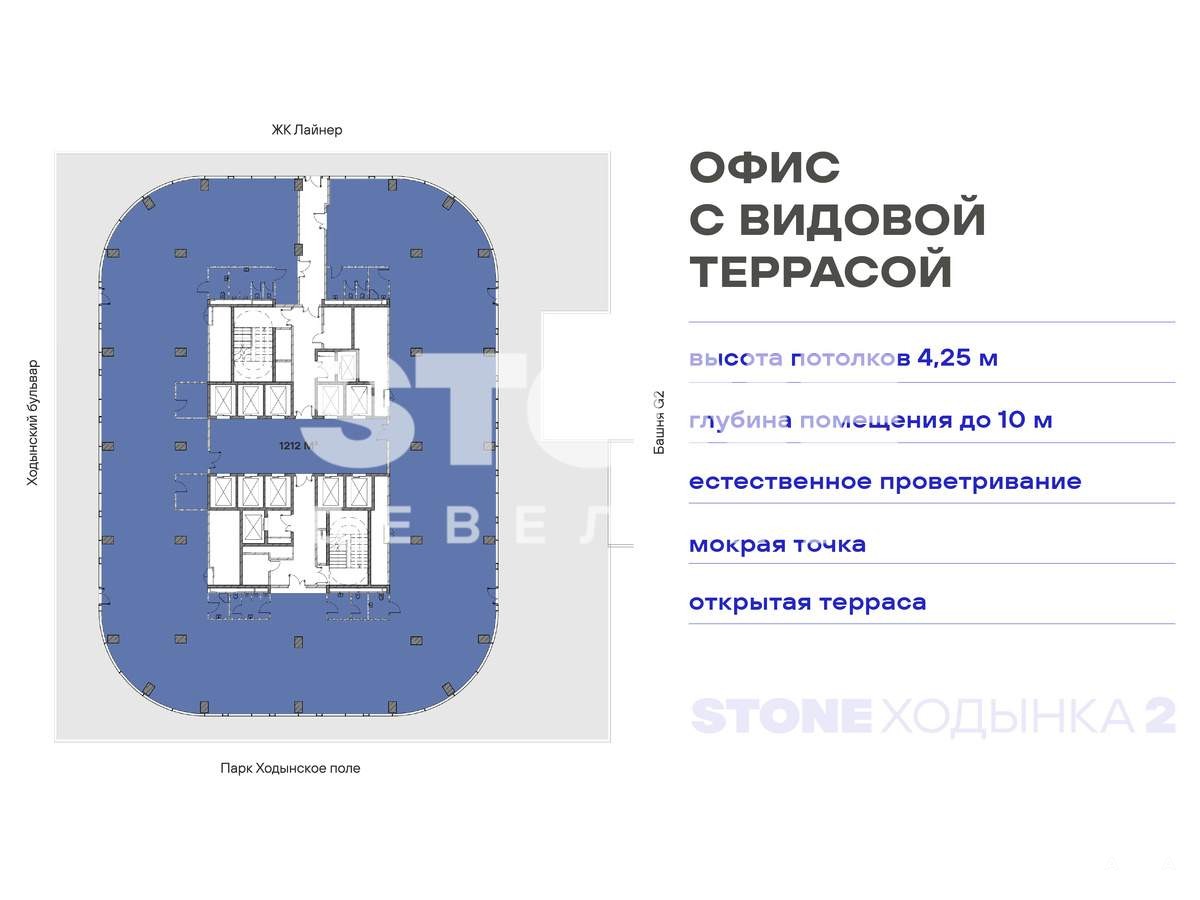 Уникальный формат коммерческой недвижимости - офисный этаж с террасой общей площадью 2075, 3 кв.м. в составе премиального офисного квартала STONE Ходынка 2 с прямым выходом в парк Ходынское поле. Идеально для размещения компании численностью 259 сотрудников.
