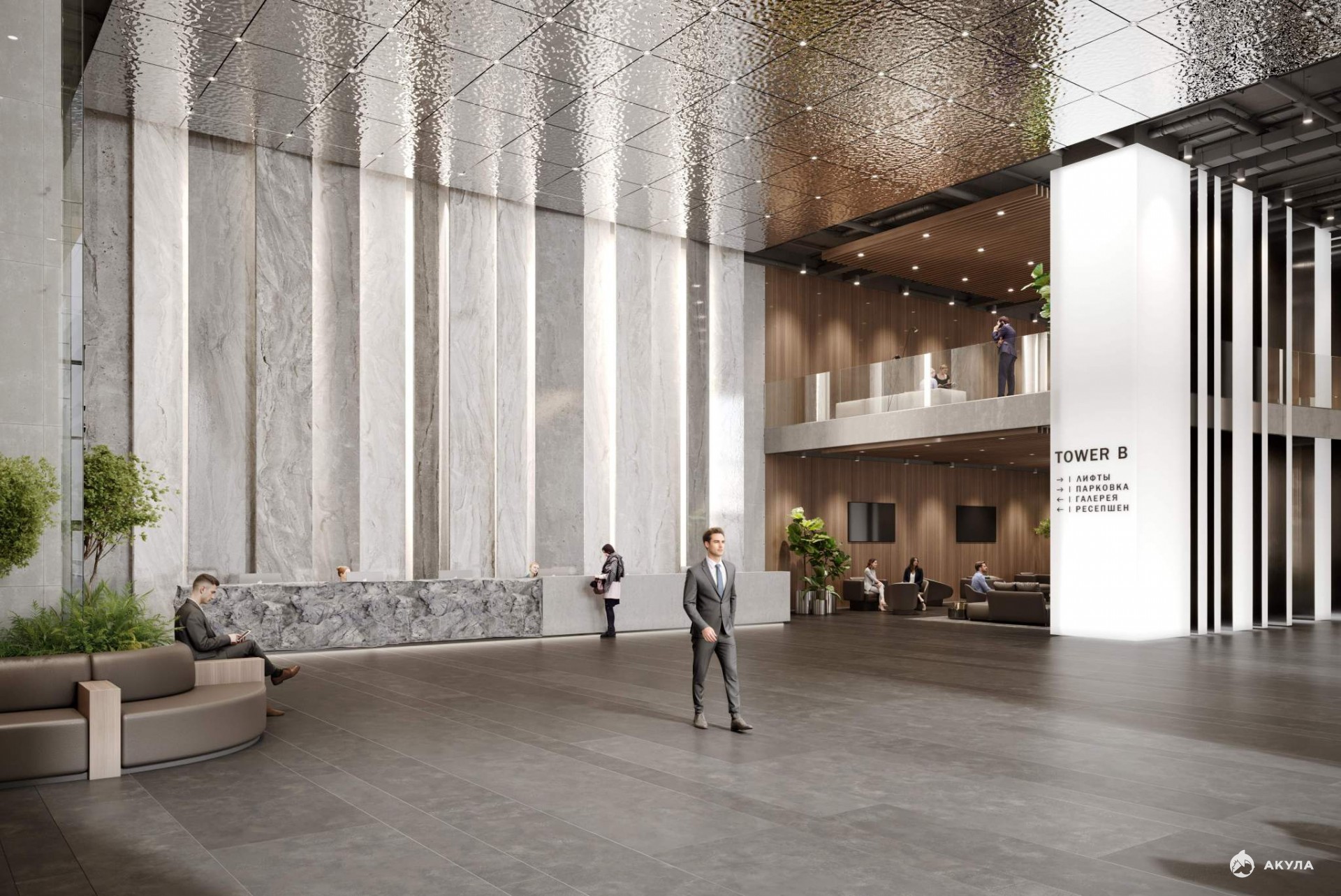 Гранд-лобби 1500 м, высота 9 м - знаковое пространство с интерьерами от бюро UNK corporate interiors.