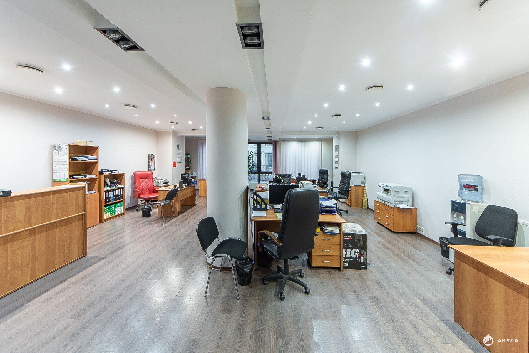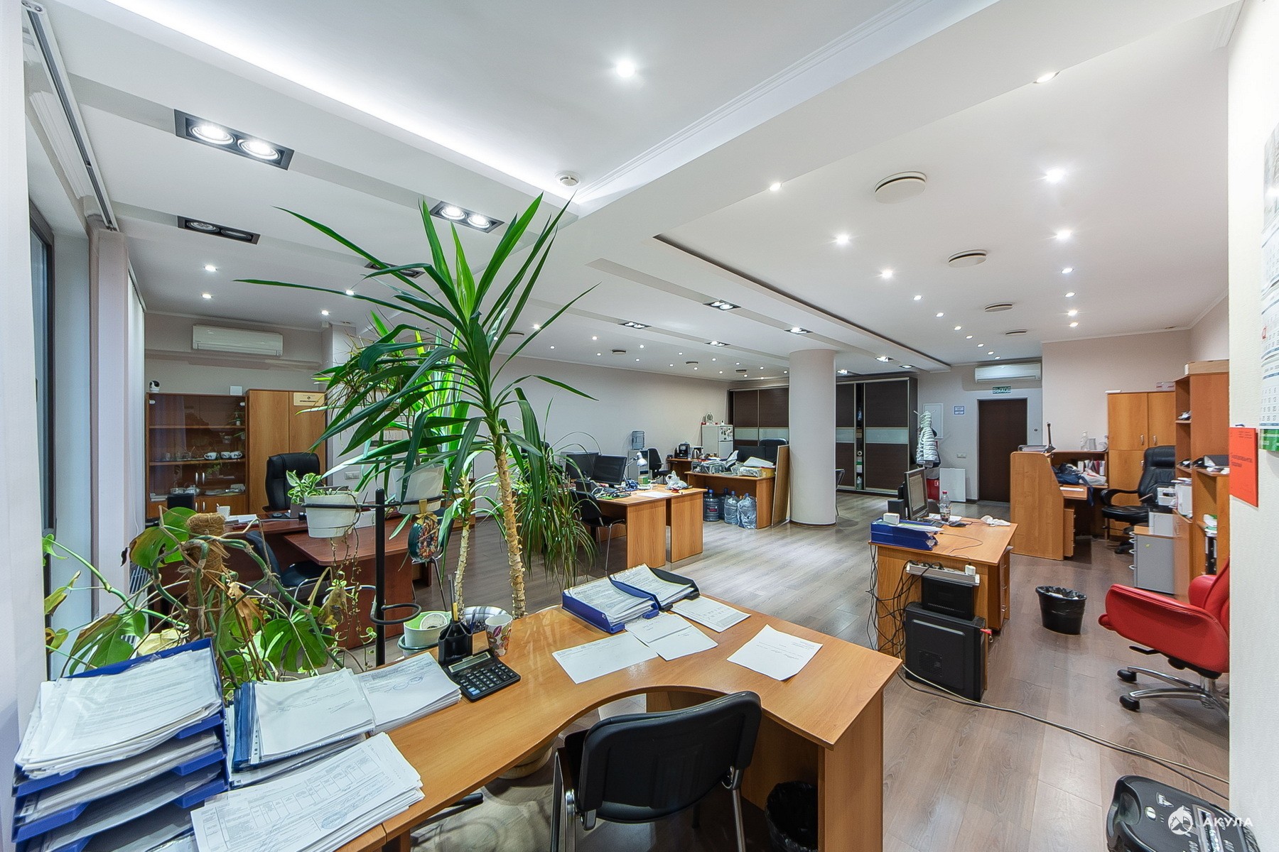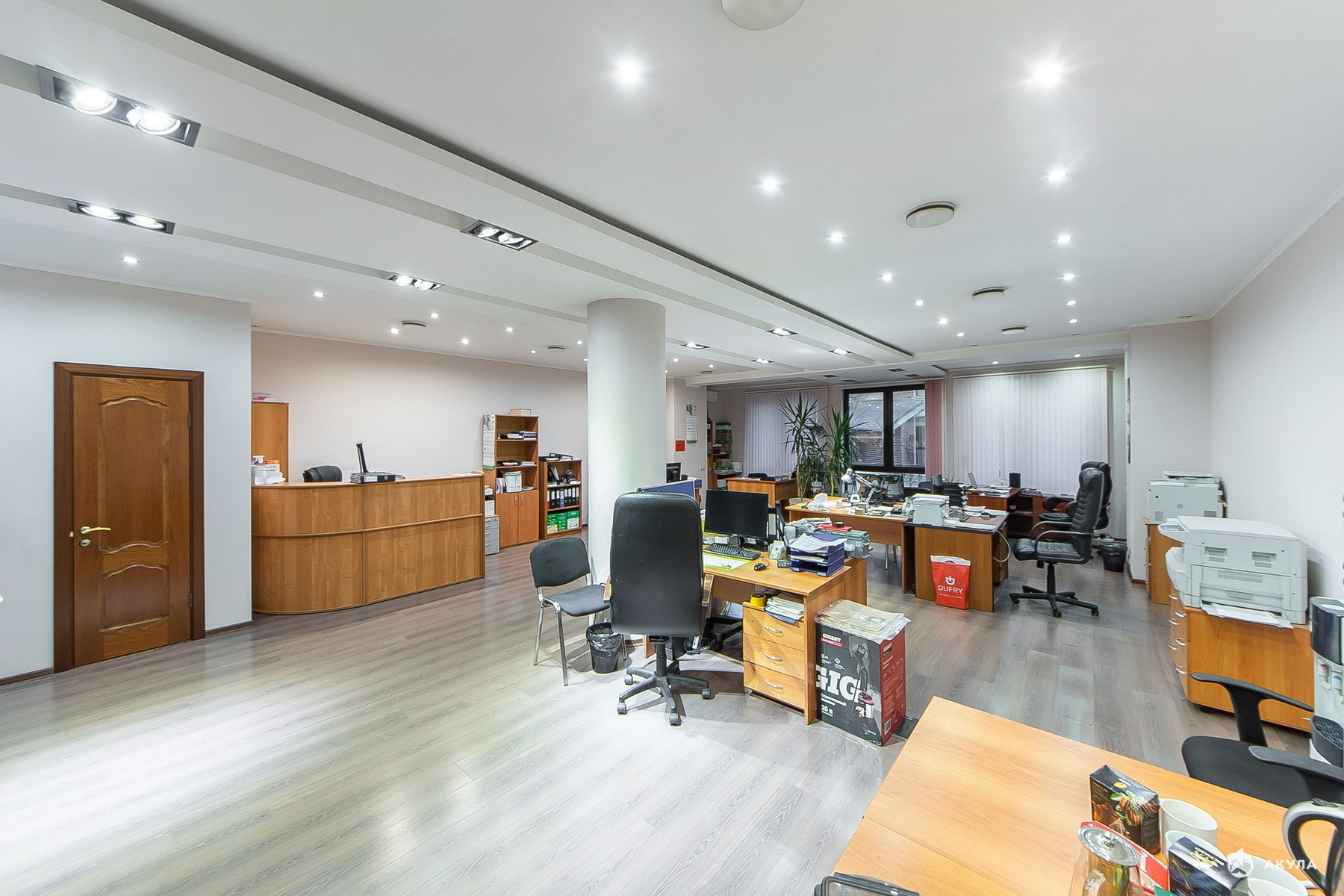 Планировка: Общая зона, ресепшн, отдельные кабинеты, два санузела.