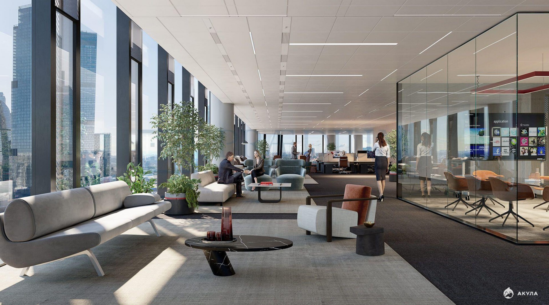 Приточно-вытяжная вентиляция. Центральное кондиционирование. Пожарная сигнализация. Интернет, телефония. Охрана. Видеонаблюдение. Система контроля доступа. Лифты: 8 шт.. Подземная парковка.
