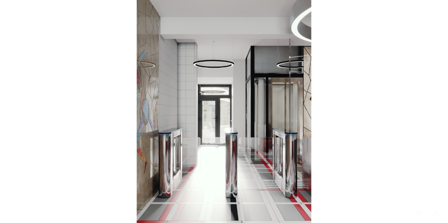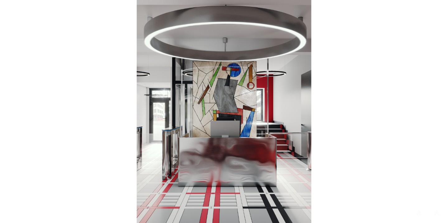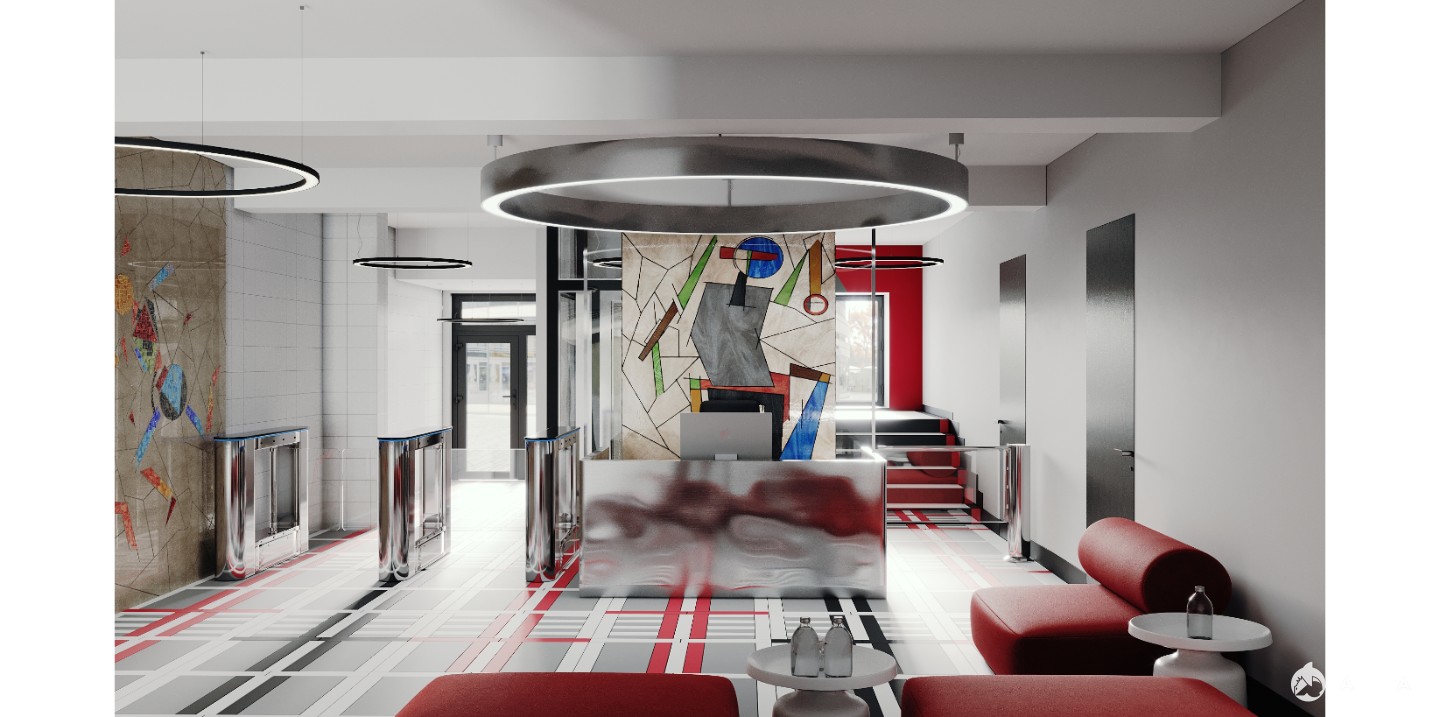 Интерьеры выполнены в духе советского конструктивизма и русского авангарда, с акцентом на функциональность, чёткие геометрические формы и индустриальные материалы — стекло, металл, керамика и мозаика.