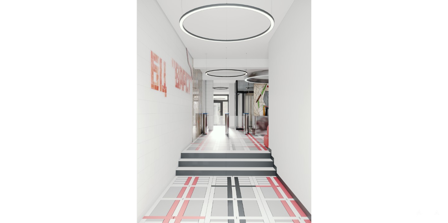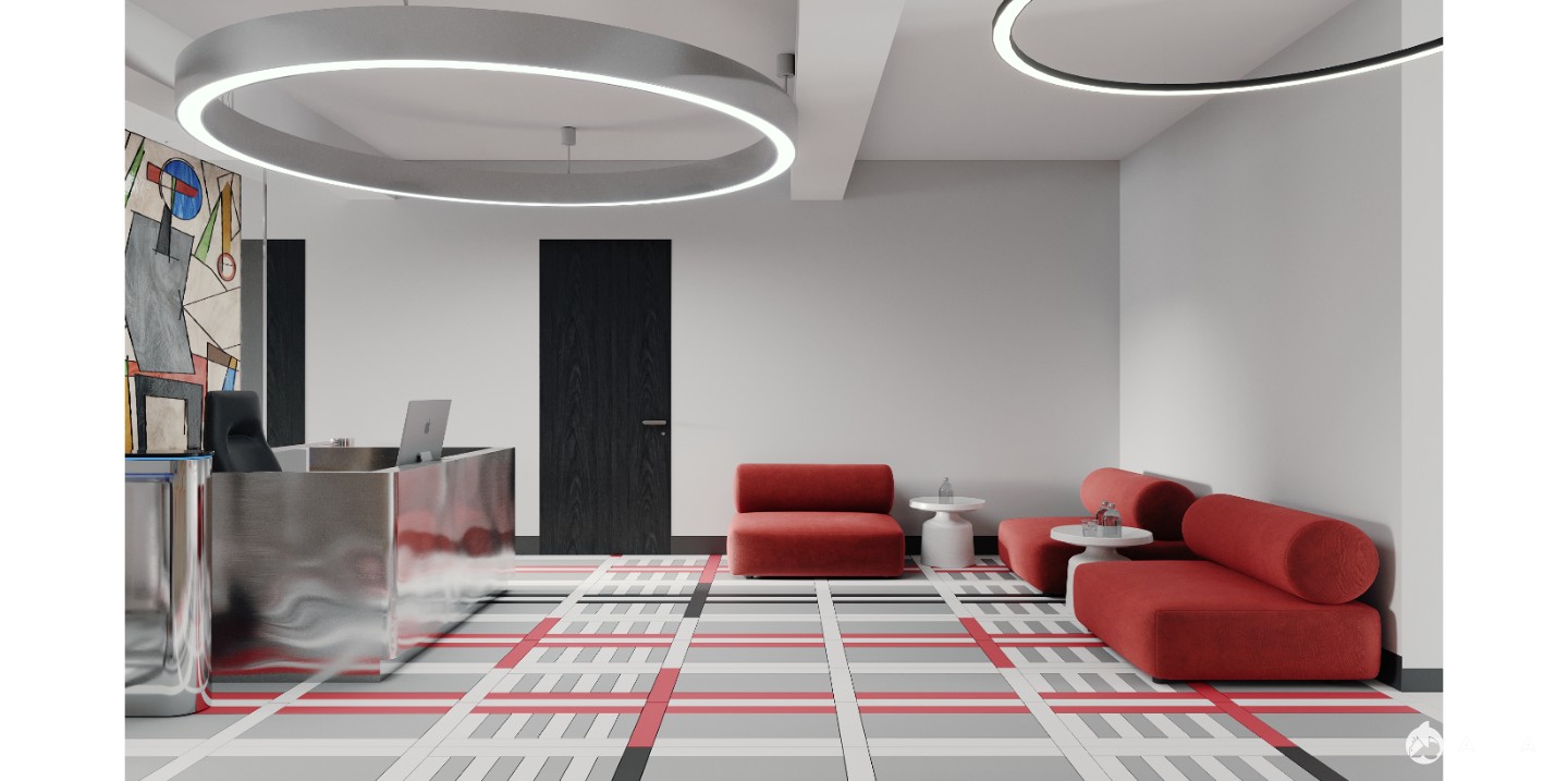 Офис находится на 3 этаже, в пространстве с высокими потолками, геометричным светом и выразительными цветовыми акцентами — стилистика отсылает к творчеству художницы Варвары Степановой и эстетике русского авангарда 1920-х годов.