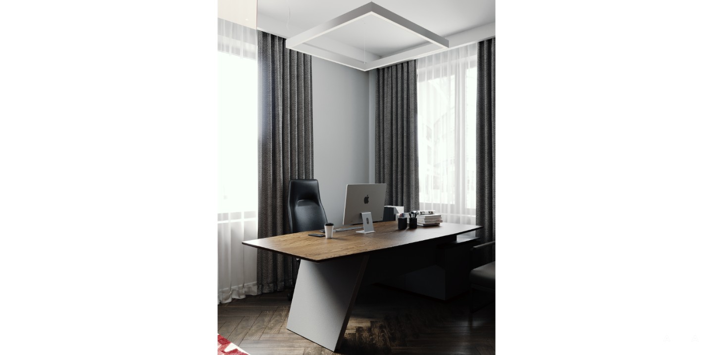 Удачно зонирован: предусмотрены переговорная, два кабинета руководителя, кухня, два санузла и отдельная зона ресепшн.