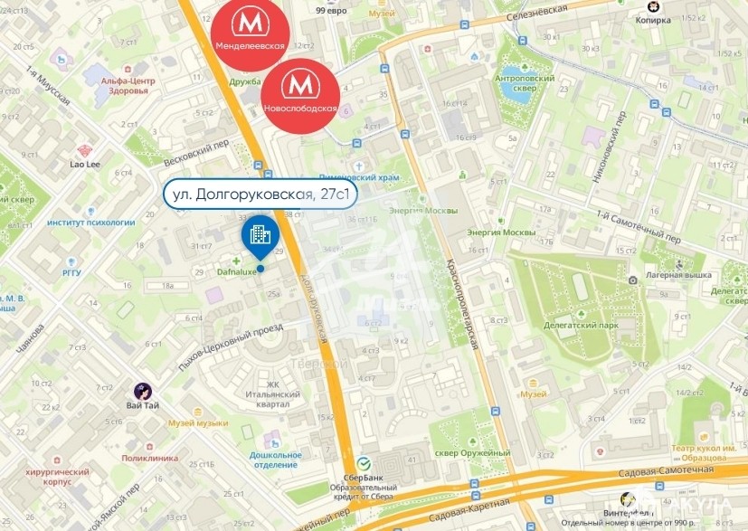 - Объект расположен в пяти минутах ходьбы от ст.м. Новослободская, у здания находится остановка общественного транспорта.