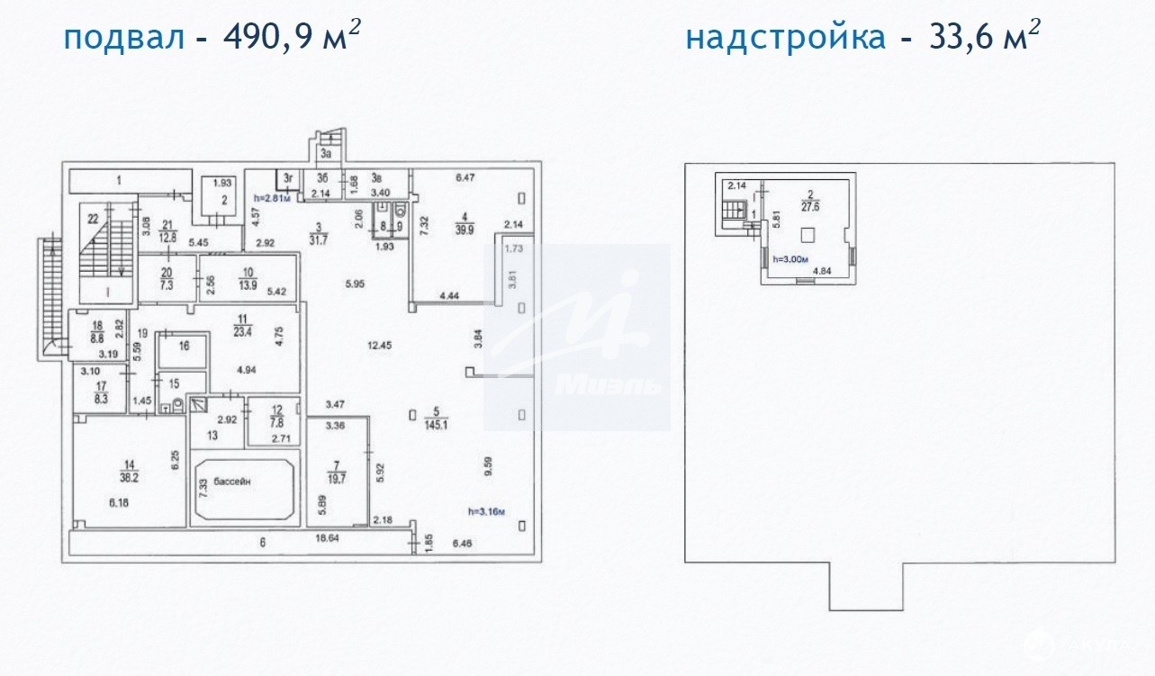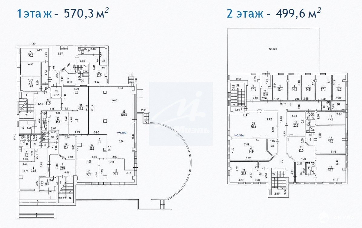 - Общая площадь - 1594, 4 м2 (1 этаж - 570, 3 м2, 2 этаж - 499, 6 м2, подвал - 490, 9 м2, надстройка - 33, 6 м2).