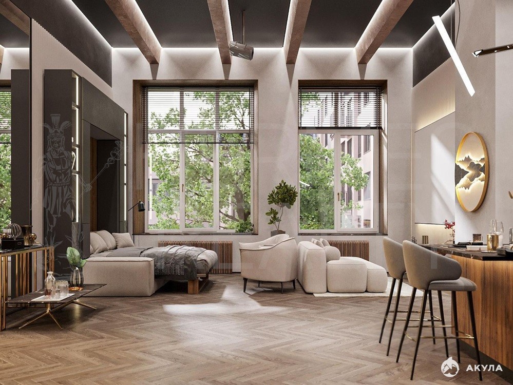 71, 8 м² на 2-м ( этаже двухэтажного корпуса исторического особняка. Высота потолков 4, 7 м. Возможность надстройки антресольного этажа (+ до 40% полезной площади). Две мокрые точки. Идёт финальная стадия дизайнерской отделки. Локация :