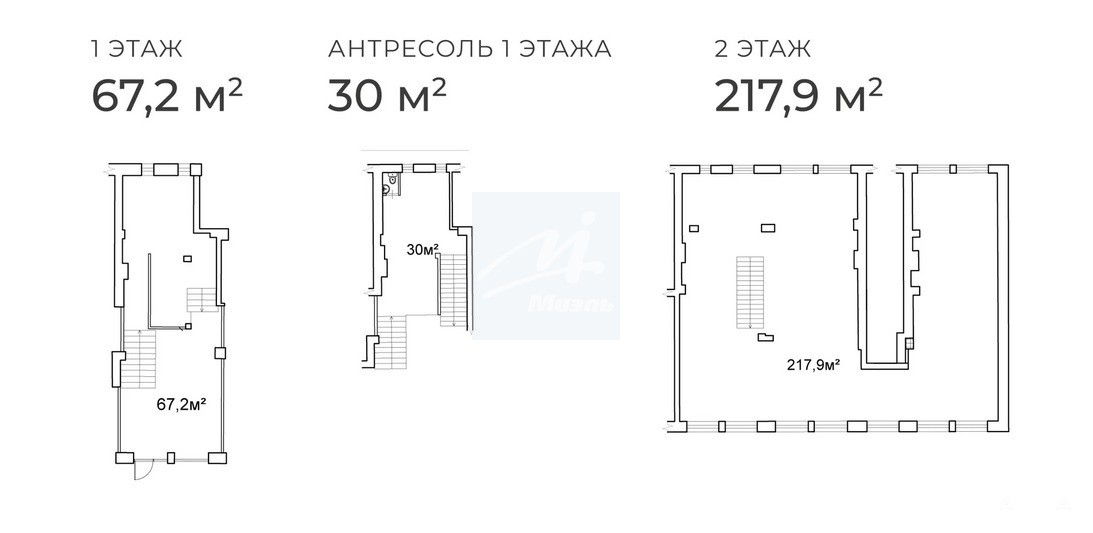 - Два этажа и антресоль: 1 этаж - 67, 2 м2, 2 этаж - 217, 9 м2, антресоль - 30 м2.