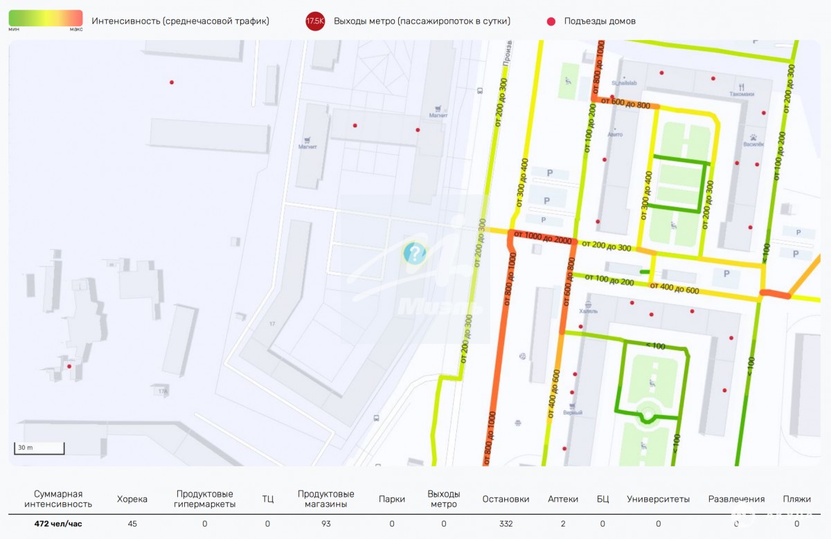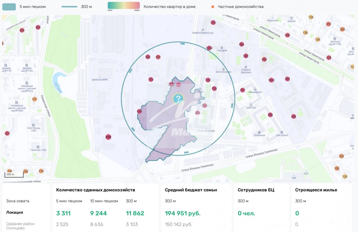 - Высокий пешеходный трафик – 472 человека в час. Среднее значение – 465 человек в час (район Солнцево).