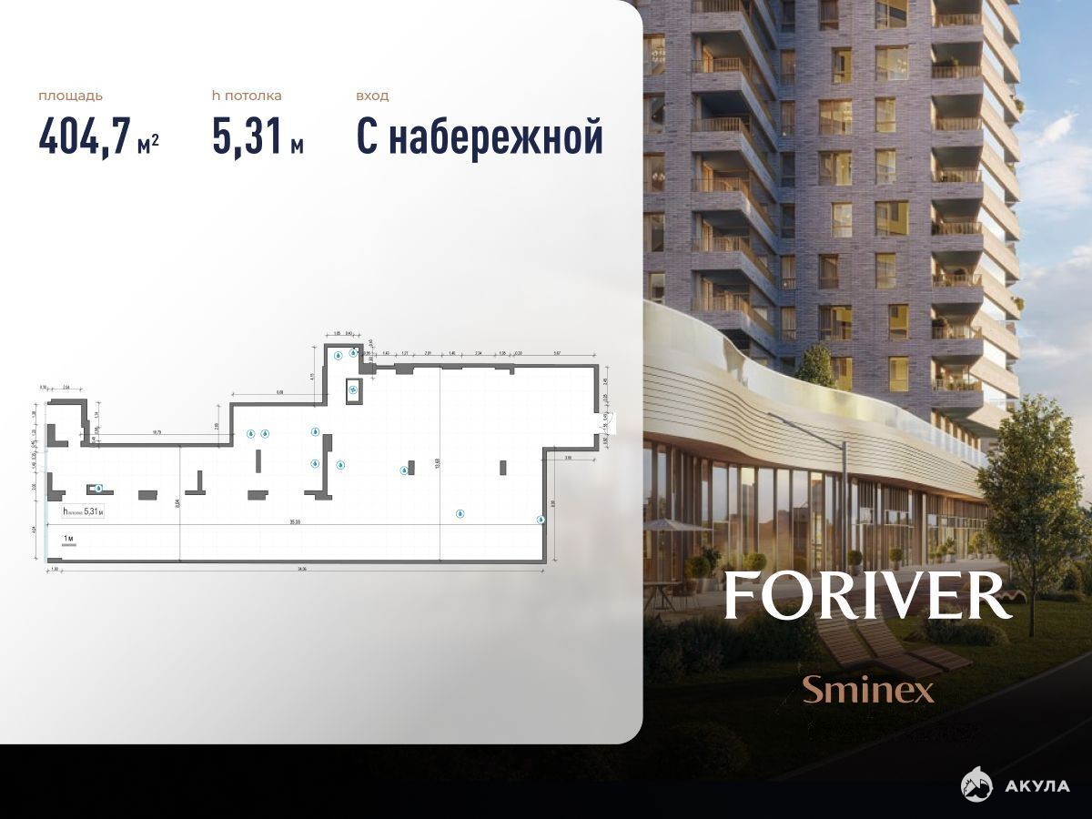 Арт. 89132620. Торговое помещение площадью 404, 7 кв.м. с технологией под ресторан в премиальном жилом квартале FORIVER. Расположено на 1 этаже жилого корпуса 4, на территории с открытым доступом, имеет прямой выход на набережную и дополнительный вход с паркинга (можно использовать как зону разгрузки/погрузки), место под рекламную вывеску и установку сплит-системы. Панорамные витрины, высота потолка 5, 3 м, 11 мокрых точек, технология для полного цикла кухни. Помещение без отделки с предусмотренной электрической мощностью 121, 4 кВт.