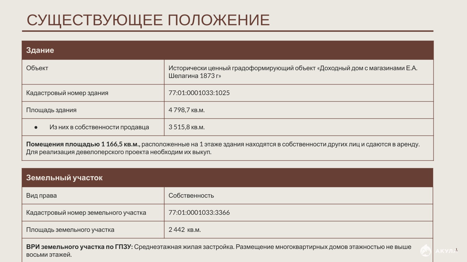 * Из них в собственности продавца 3 515, 8 кв.м. **Помещения площадью 1 166, 5 кв.м., расположенные на 1эт. здания находятся в собственности других лиц и сдаются в аренду. Для реализация девелоперского проекта необходим их выкуп.