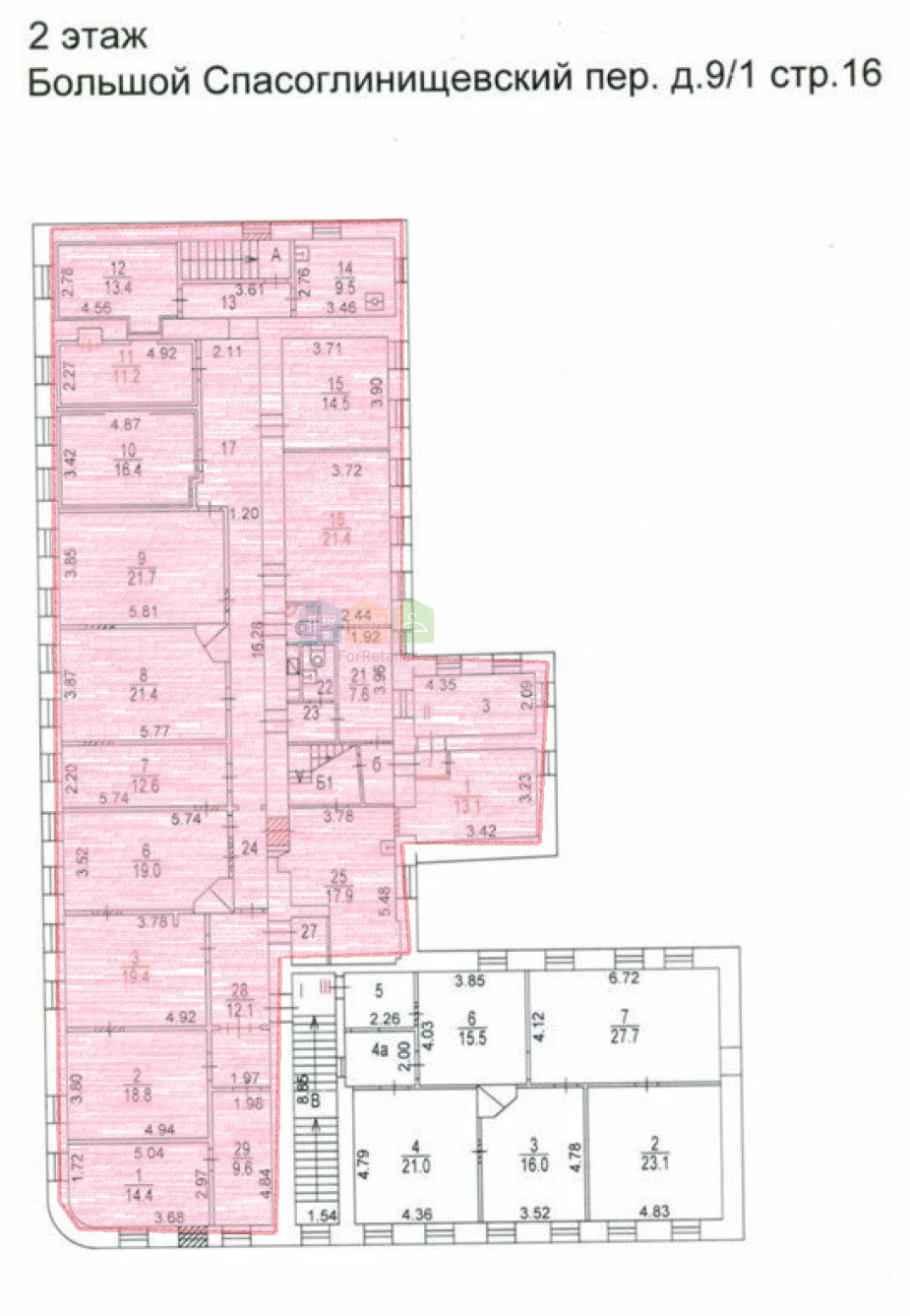 Помещение представляет из себя часть второго этажа двухэтажного здания с большой парадной лестницей с ул. Забелина и вторым выходом на Б Спасоглинищевский пер.(см. фото). Над частью помещения обустроены антресоли (см. план БТИ).