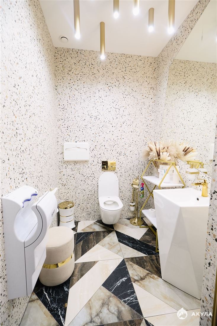 Ох, ребята, вы бы только видели эту красоту! Здесь всё продумано до мелочей: полы и стены из шикарного испанского керамогранита, элегантные стеклянные перегородки, мебель, созданная по индивидуальному проекту, потрясающее панно из натурального оникса и современное освещение.