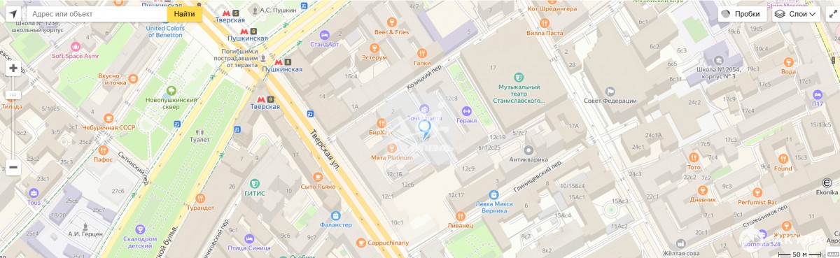 - Рядом: Московский театр мюзикла, Московский государственный театр, Московский музей современного искусства. Парковые пешие зоны: Пушкинский сквер, сад Эрмитаж, Тверской бульвар.