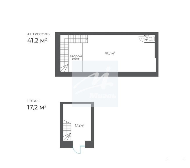- Один этаж и антресоль: 1 этаж - 17, 2 м2, антресоль - 41, 2 м2.