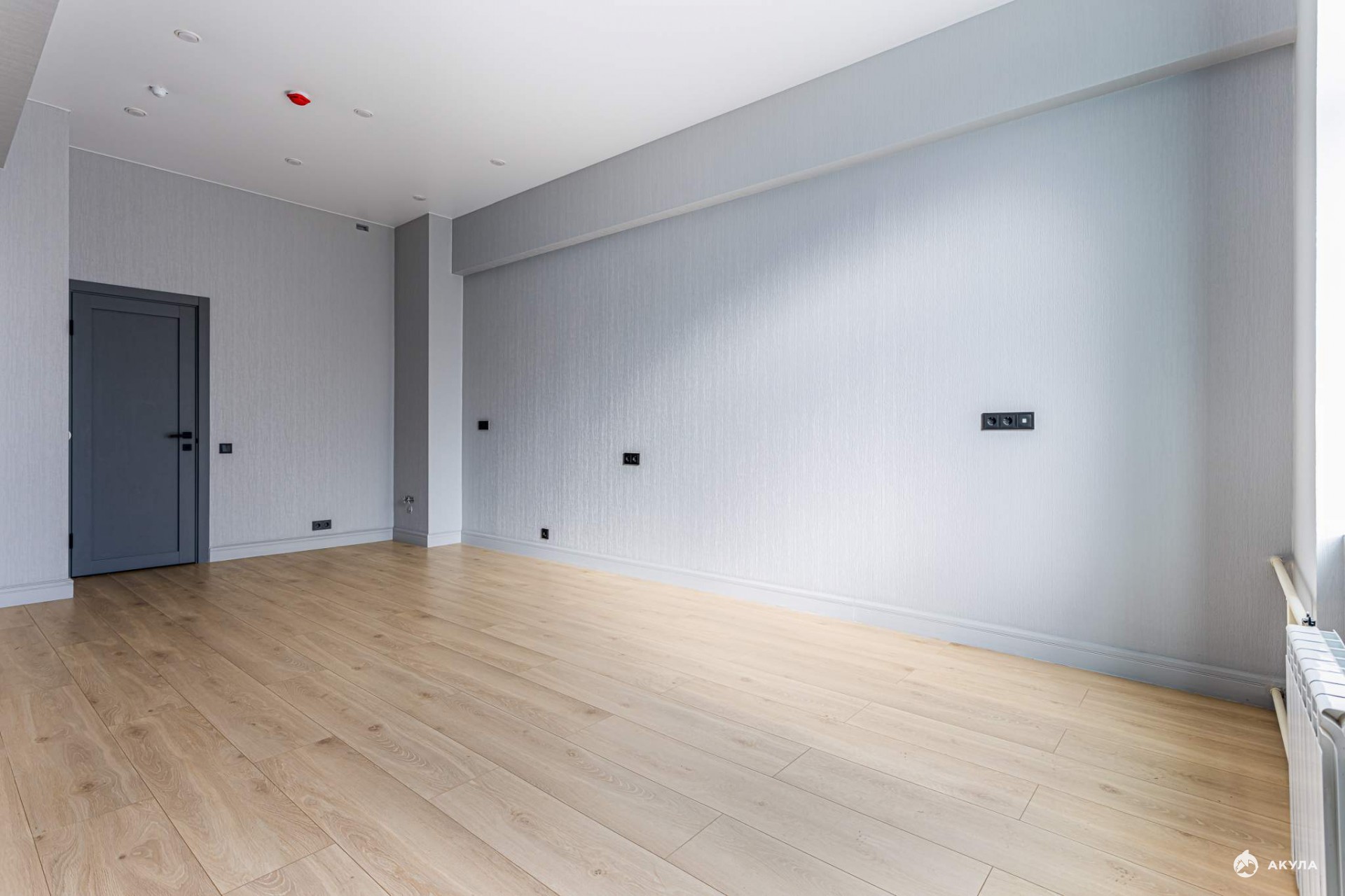 На полу постелен ламинат, на стенах поклеены светлые обои.