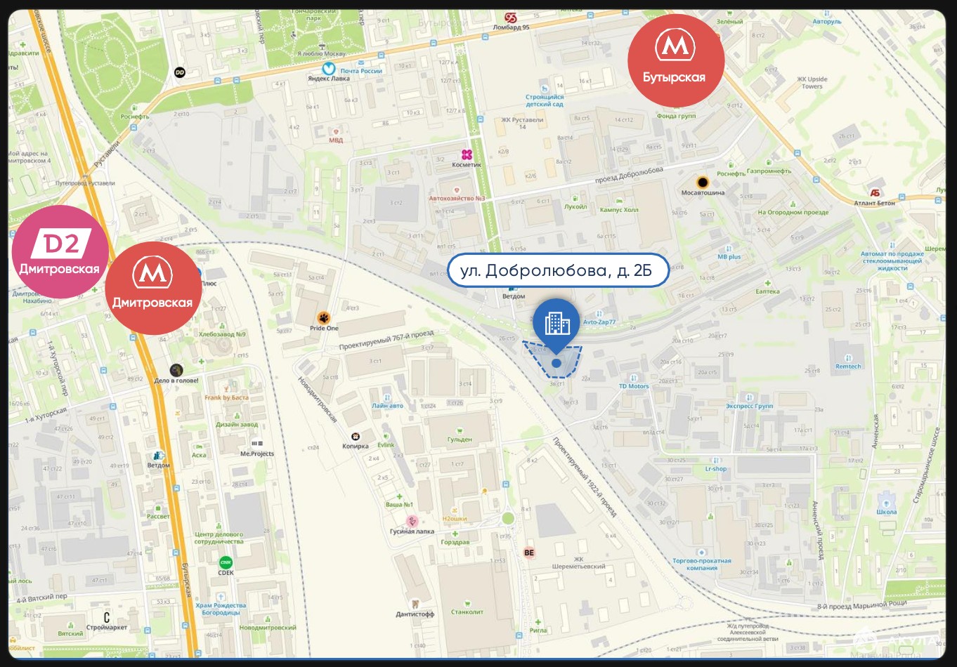 Локация с высокой транспортной доступностью: рядом станции метро Бутырская и Дмитровская, плотный автомобильный и пешеходный трафик.