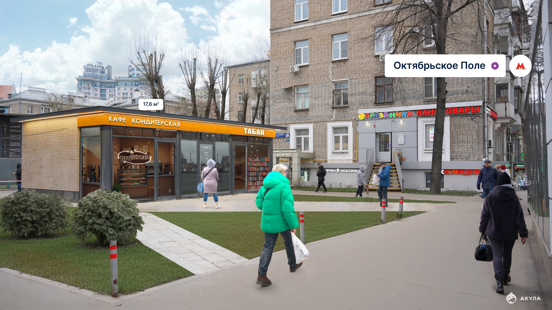 Метро: В шаговой доступности от станции метро «Октябрьское Поле» (менее 1 минуты пешком).