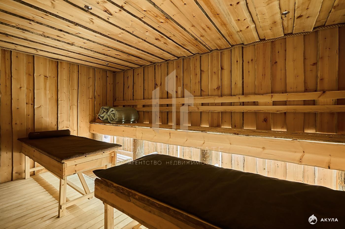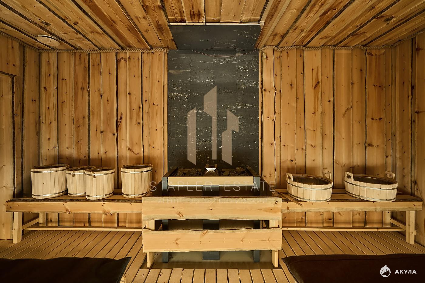 В комплексе спланированы: хамам, сауна, бассейн, купель, зал с большим столом, диваном и креслами и камином, комната отдыха, массажный кабинет, а также комната для курения.
