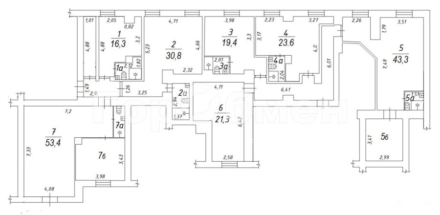 По документу площадь помещения (номер 6 на схеме) 21, 3 кв.м Полезная площадь около 15 кв.м - в углу комнаты трубы (при желании можно отгородить стеной, конечно, оставив к ним доступ).